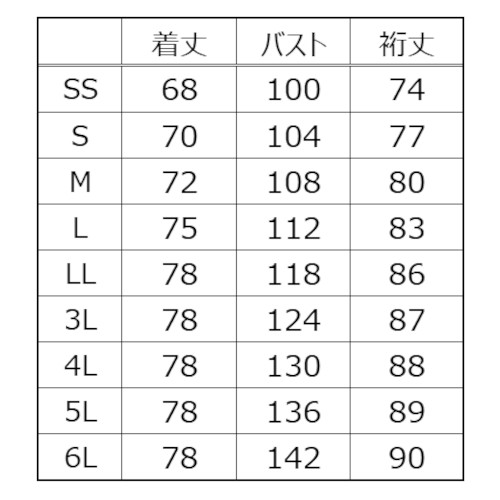 | 白 ブルー グリーン | SS S M L LL 3L 4L 5L 6L | 1~ | ¥3,740 |