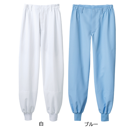 優れた形態安定のニット素材に汚れ落ちに優れた防汚加工をした高機能素材の住商モンブランの工場白衣パンツ(ノータック脇ゴム仕様)