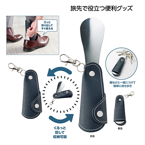 折り畳み式で携帯しやすいコンパクトな靴べら。落ち着いた色味でスーツなどどんな服装にも合い、鞄やキーホルダーにもつけやすいナスカン付き。