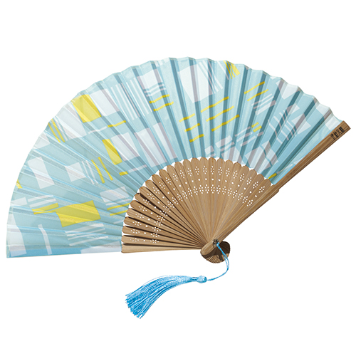 伊砂文様シリーズの新しい夏柄を使用した扇子。涼しい色味と文様で構成されたモダン和柄に、持ち手部分に伊砂文様のロゴとタッセル付き。
