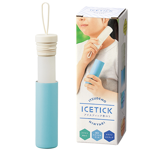 大流行の凍らせて使えるスティック型氷のう。保冷効力が高い真空ステンレスケース付きで、持ち運んでいつでも熱中対策ができる商品です。