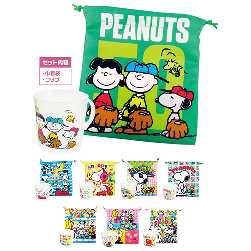 子供たちが喜ぶかわいらしいキャラクター柄のデザインされた巾着とコップがセットになった低単価な商品です。