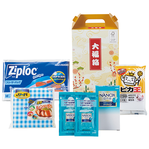 うれしい生活消耗品のギフトセットです。どれもこれも毎日使う日用品がいっぱい。目を引くおめでたいデザインの化粧箱入り。