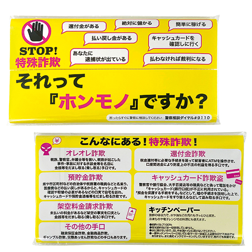 特殊詐欺防止を啓発するキッチンペーパー。裏面にはいろいろな特殊詐欺が紹介されています。イベントの注目度がアップすること間違いなし。