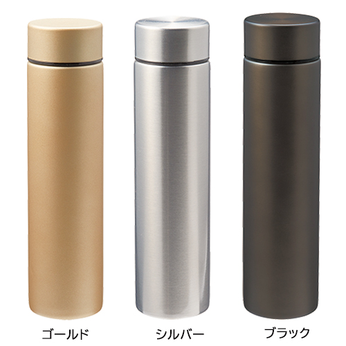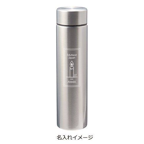 シックで高級感のあるスリム形状ボトル。ステンレス真空二重構造による保冷温力。名入れがしやすいシルバー単色で使いやすい。