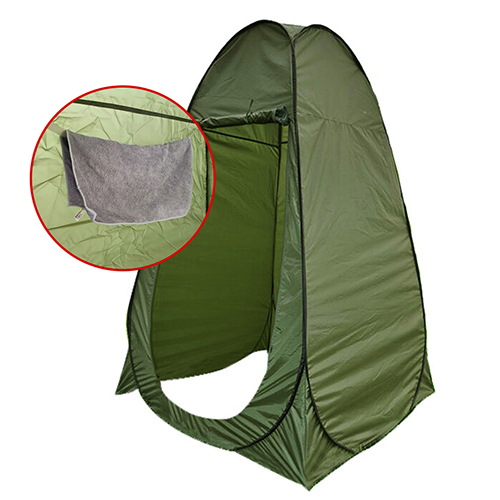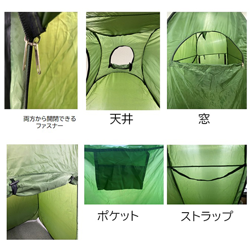 災害時や着替えなどに活用いただけるテントルームです。ワンタッチで組立可能。テント内にタオルなどを引っ掛けることができるストラップと、小物入れポケット付き!