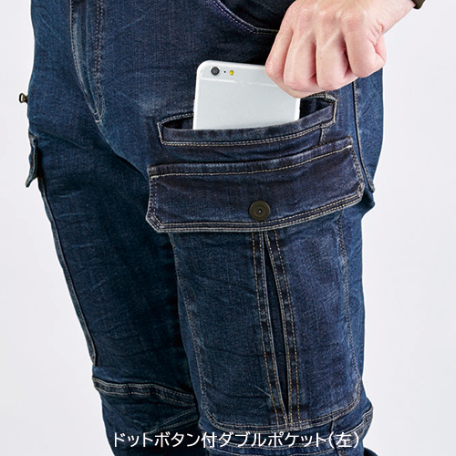 ヘビーウェイトな生地厚と動作性を損なわないストレッチ性を両立させ、タフさを感じさせる大型ポケットを大胆に配した現場でガンガン使えるハードユースコットンワークウェア