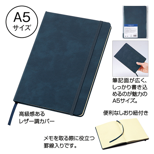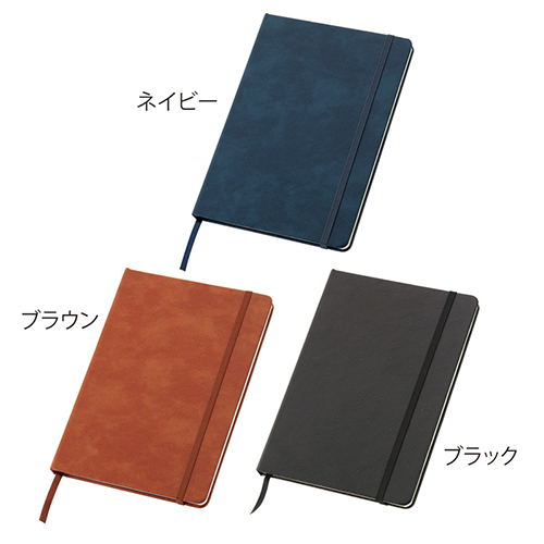 落ち着いたカラーとレザー調ハードカバーが高級感を演出。携帯も書き込みもしやすいサイズのノートです。