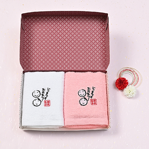 「健康長寿」の刺しゅう入りフェイスタオル2枚をすてきなギフト箱にセットしました。