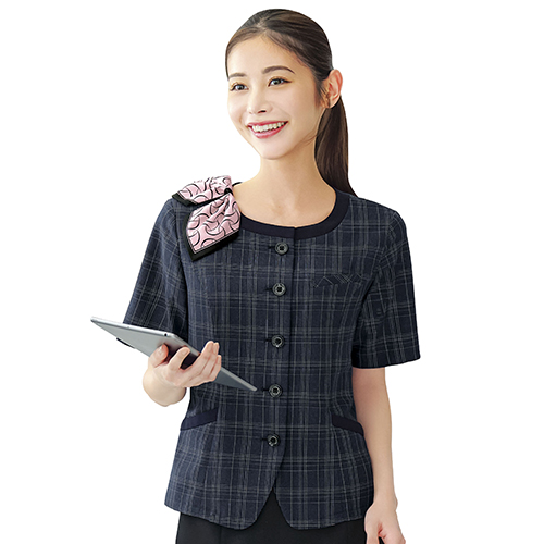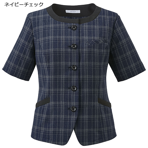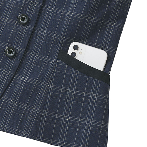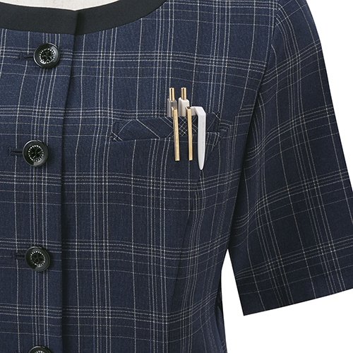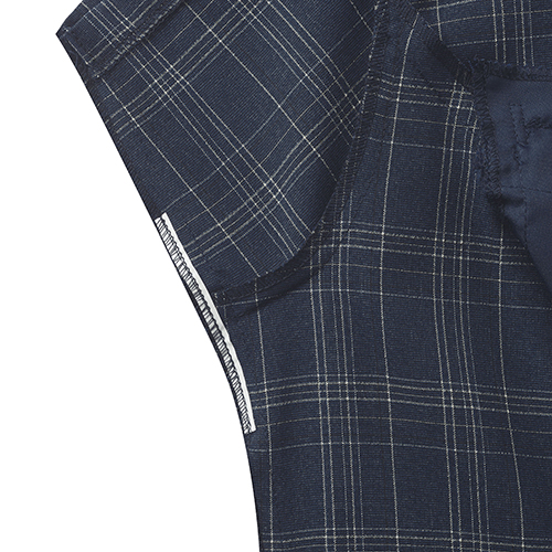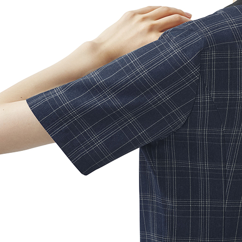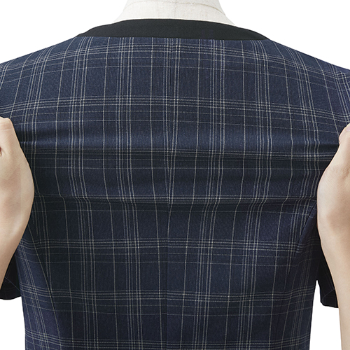 大柄で華やかな印象のランダムチェック柄。2色以上の糸を混ぜて作られたメランジ調のネイビーベース生地に、プラチナベージュの差し色が落ち着いた雰囲気を演出。2wayストレッチの薄手で軽い素材のため、涼しく快適な着心地です。吸汗速乾性もあり、洗濯の乾きも早いのでメンテナンスも簡単なENJOYオリジナル素材です。