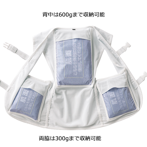 縦入れの保冷剤ポケットと2ヶ所のフロントバックルでより快適な着用感を実現。