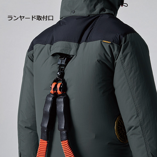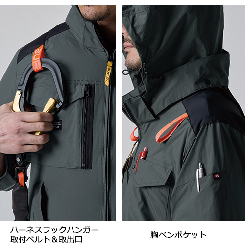 ヘルメット収納フード(着脱可能)・フックハンガー・背ランヤードホールを配備しフルハーネスに完全対応。