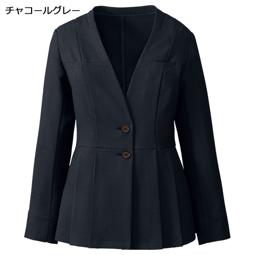 ノンストレスでゆったり着られるノーカラーのペプラムジャケット。すっきりとした襟元とウエストから広がるプリーツが美シルエットを演出。