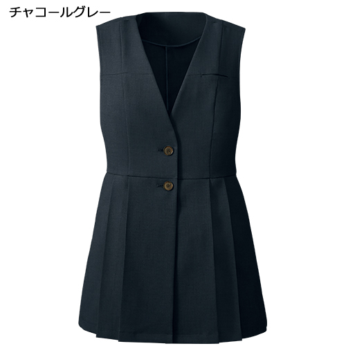 プリーツがポイントのロングベスト。ウエストから全体的に360°プリーツを施すことで体型カバーと動きやすさを両立。端正なシルエットで暑い日のジャケット代わりにも。