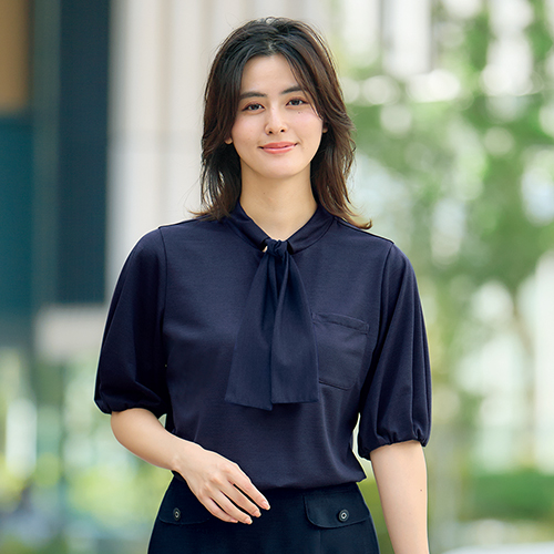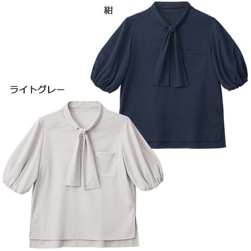 ボウタイ風のリボンが印象的なデザインプルオーバー。袖口ゴムの立体的なスリーブが奥行きのあるスタイルを実現。深めのサイドスリットで裾OUTスタイルでも着映え。