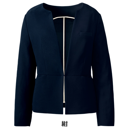 キーネックラインのノーカラージャケットはフロントホック仕様でミニマルに。ウエストを絞った立体的なシルエットでスタイルアップ効果も。