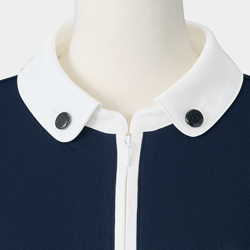 ・デイジーが刻印されたオリジナルボタンを添えたクレリック衿