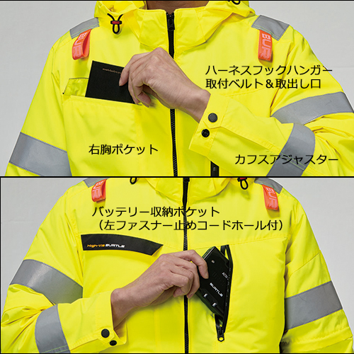 ヘルメット収納フード(着脱可能)・フックハンガー・背ランヤードホールを配備しフルハーネスに完全対応。