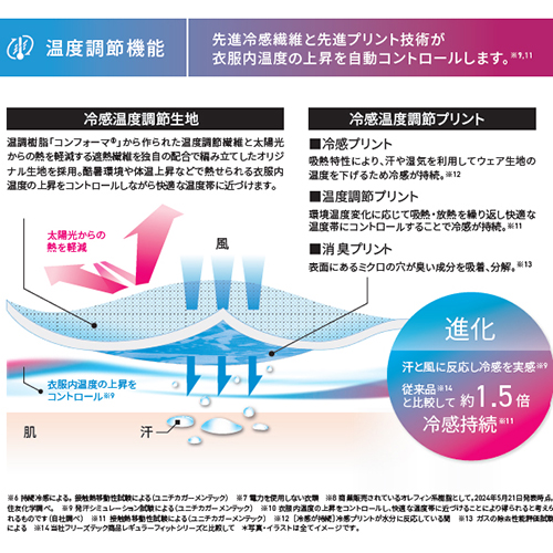 酷暑環境や体温上昇などで熱せられる衣服内温度の上昇をコントロールしながら快適な温度帯に近づけます。