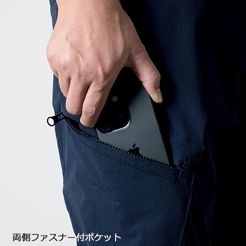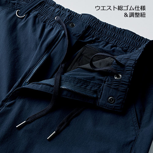 腰や膝裏部分にパンチング生地を使用し通気性を向上。