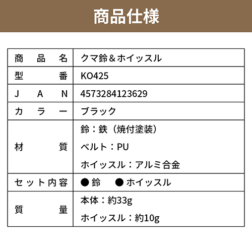 ●材質:クマ鈴/鈴:鉄(焼付塗装)・ベルト:PU、ホイッスル/アルミ合金