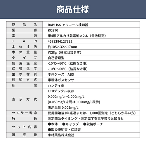 ●センサー寿命:使用開始後1年経過または、1000回測定(どちらか早い方)