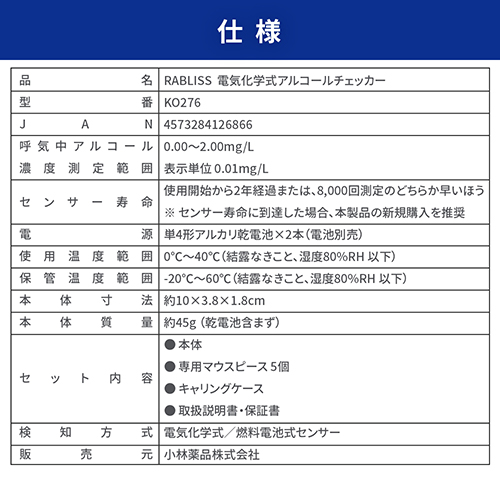 [小林薬品] RABLISS電気化学式アルコールチェッカーKO276