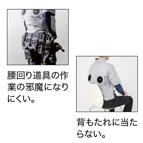 背中上部にファンを設置した上部ファン(ハイバックファン)仕様の空調服®です。座った時に背もたれとファンがぶつからず、また腰袋/腰ベルトや草刈機など腰回りの器具と干渉することもありません。邪魔にならないファン位置で作業の効率を上げます。