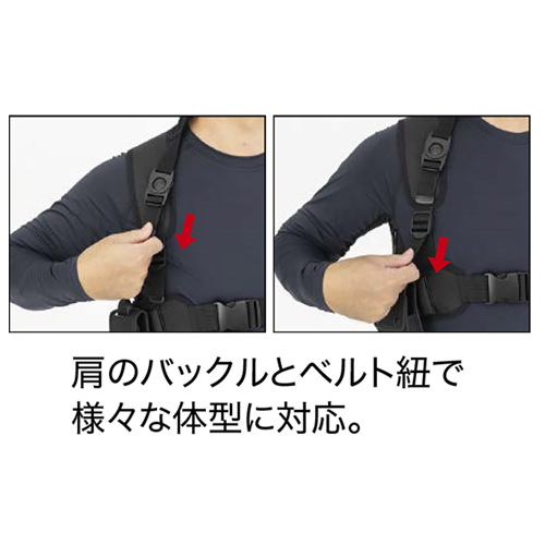 ●肩バックルとベルトひもで体型調整