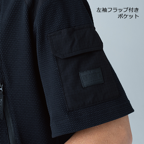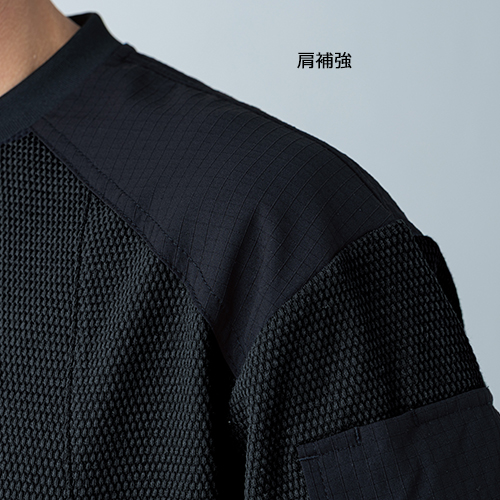 両肩部分には補強素材を使用し、左袖のポケットやハーネスを着用しても使える位置にファスナーポケットを採用している。ワークシーンを想定し、使いやすさを考慮したワークTシャツとなっている。