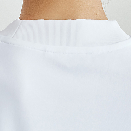 首の後ろにかけて襟を高く傾斜させたデザインで、ジャケットの襟とのバランスを美しくキープ。皮脂や汗によるジャケットの襟裏汚れも防止。