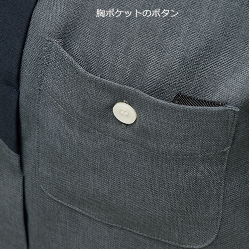 小物の落下防止にも便利な胸ポケットのボタンとフラップ風のステッチが胸ポケットにアクセントを加えます。