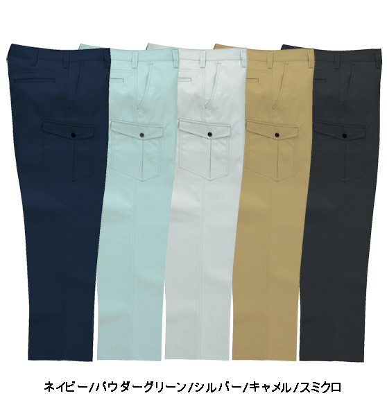 ノータックならではのすっきりしたシルエットも魅力。パウダーグリーン・シルバー・ネイビー・キャメル・スミクロの計5色展開。ポリエステル65%、綿35%(ツイル)の混合の素材。