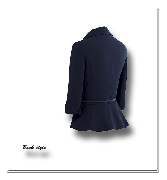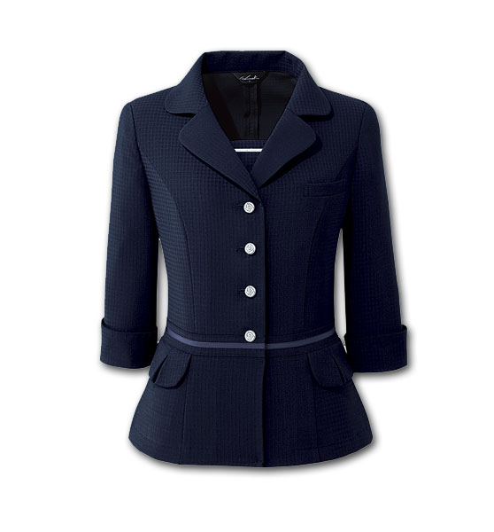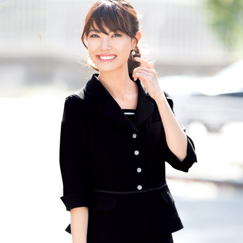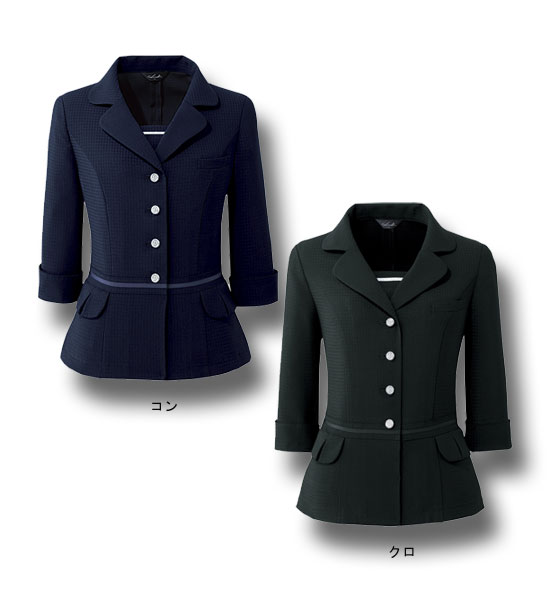 清楚で愛らしいデザイン。風を通す軽やかさと、なめらかなストレッチ性で、きちんと見せつつ着心地は快適に。光でほのかに浮き出るチェック柄や、ボタンが上品な印象です。